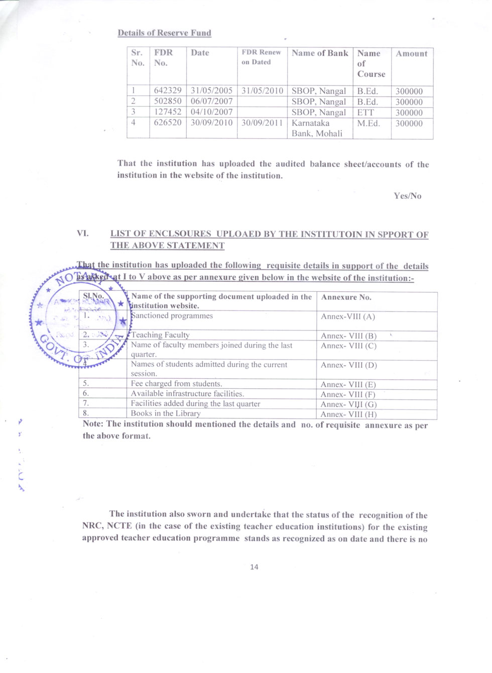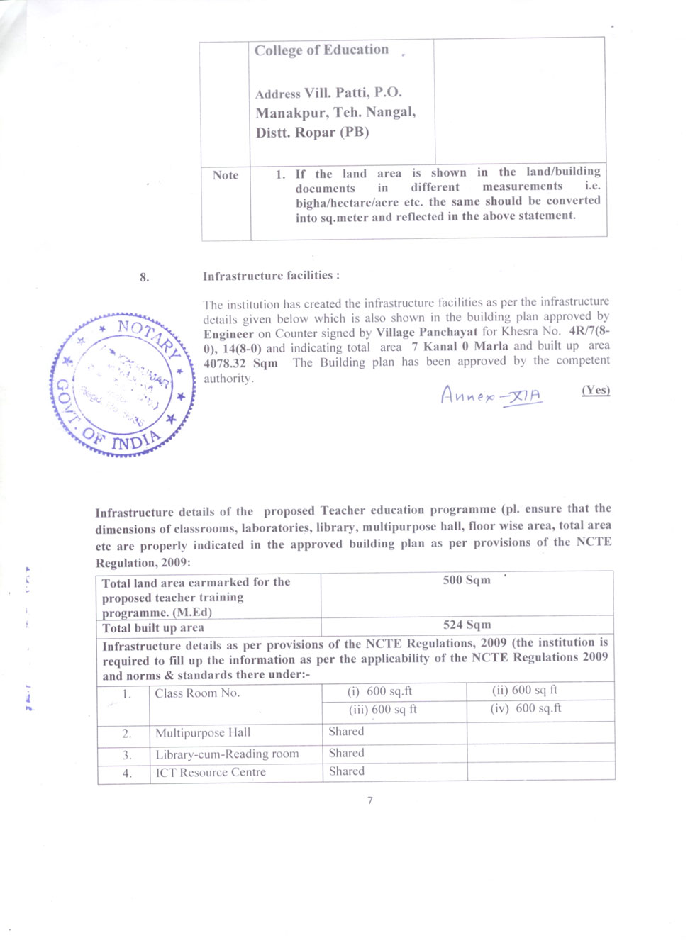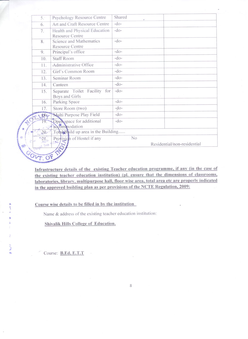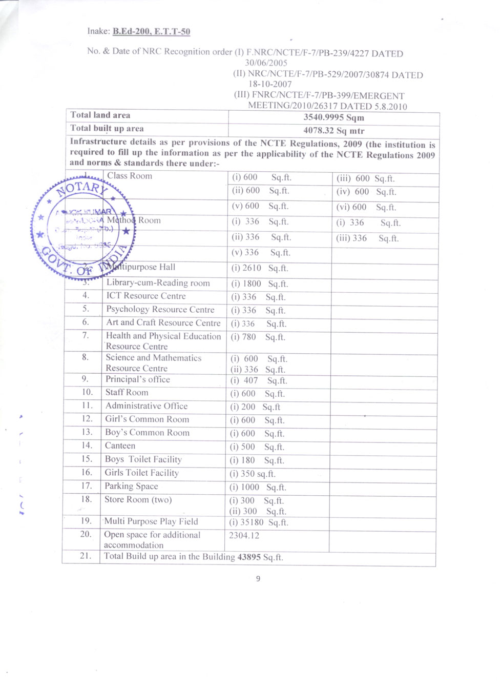 | 1 | B.Ed Course | : | 2 Units (100 students) |